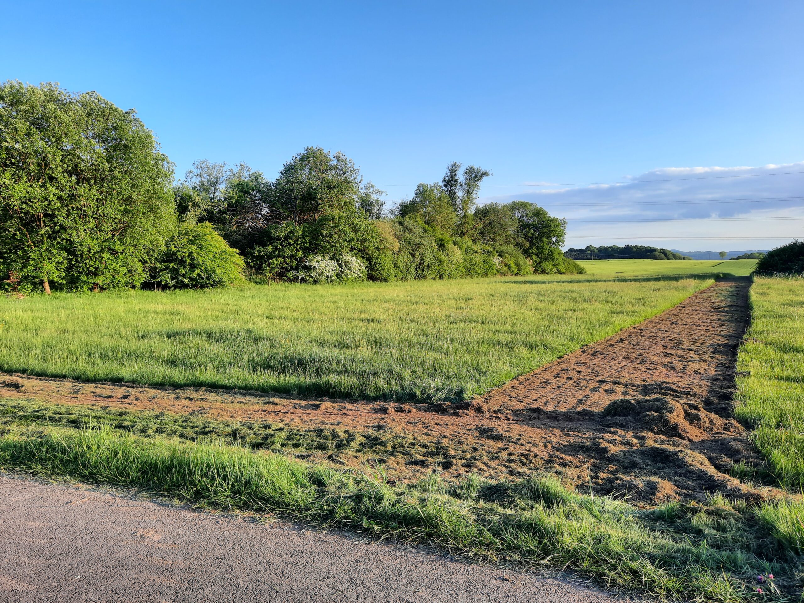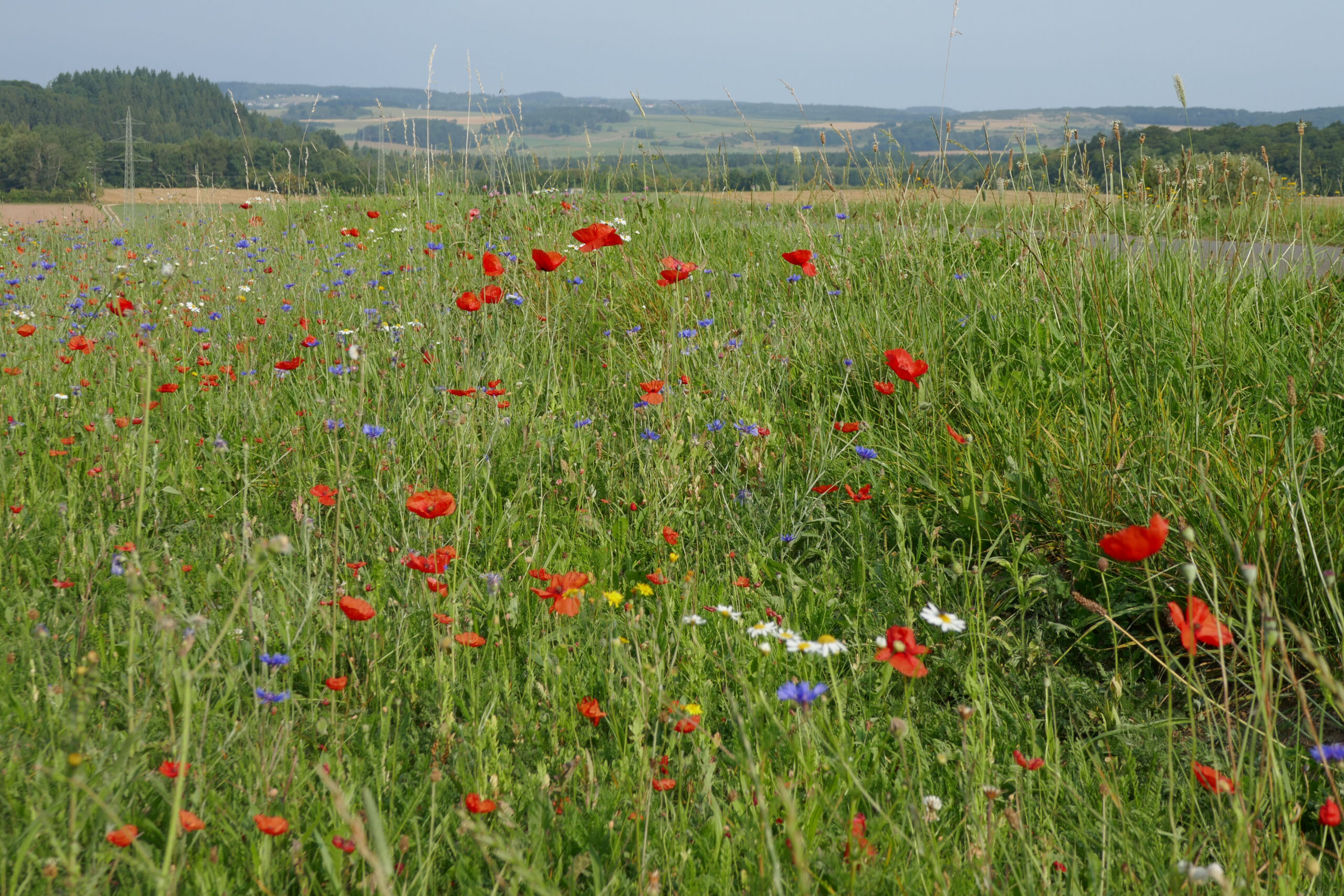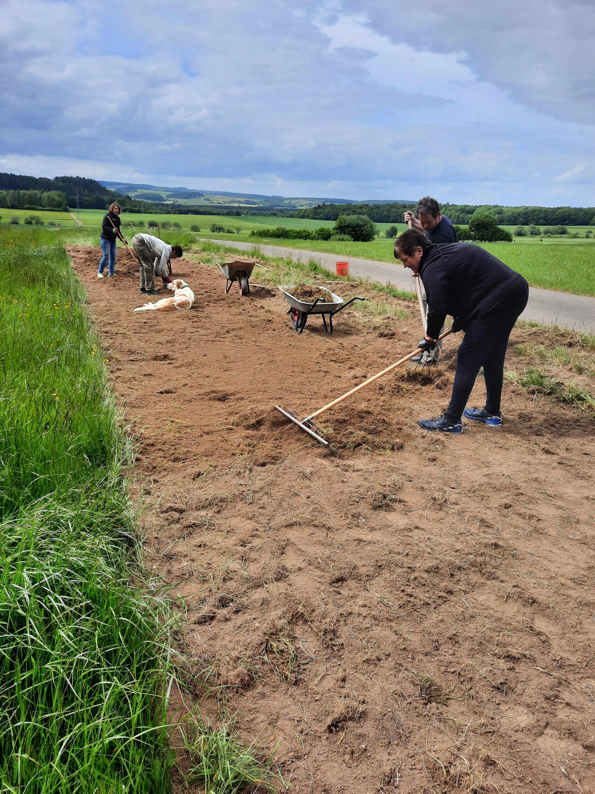 Um diesen Vorgang zu beschleunigen, legte die Umweltgruppe Berndorf einen umlaufenden Blühstreifen an, Mitte Mai war der Streifen mit einer Kreiselegge bodenschonend vom dichten Gras befreit worden (Danke an Bauer Friedhelm Schmitz aus Mirbach), Ende Mai und Anfang Juni wurde nach Entfernen der Mulchschicht mit heimischem Saatgut (Fa. Rieger und Hofmann) eingesäht.