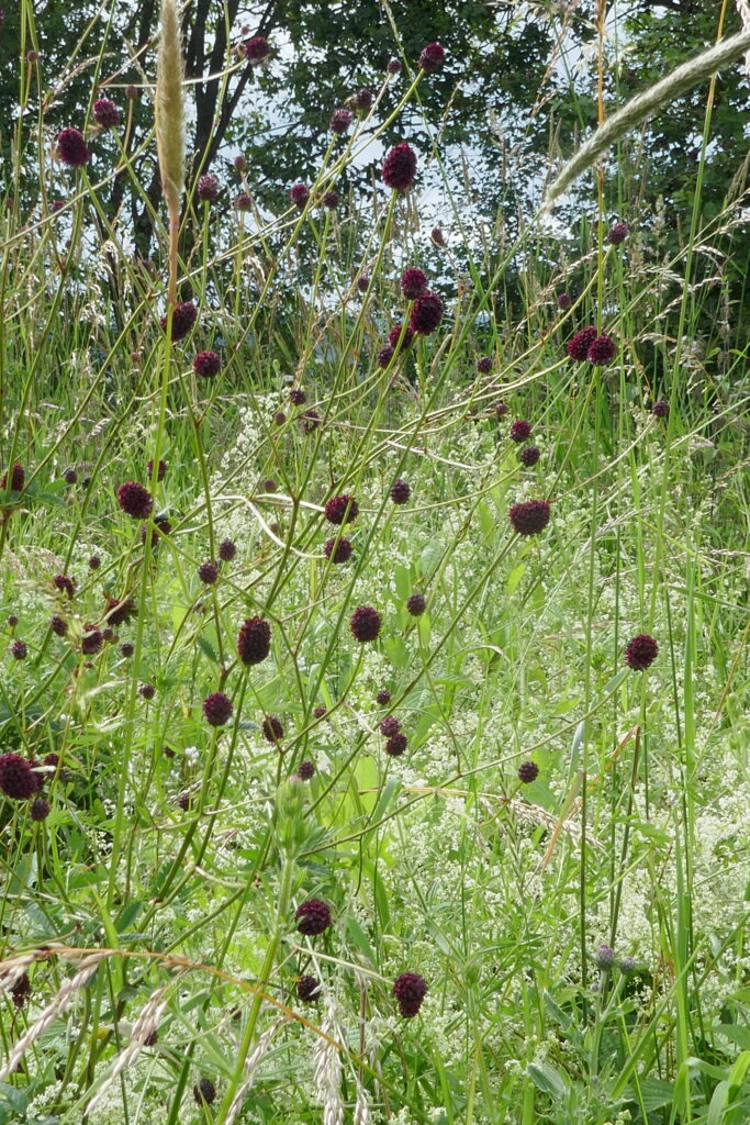 Der Große Wiesenknopf (Sanguisorba officinalis) wächst bisher nur in 3 Exemplaren im vorderen Lehmkaulbereich. Er benötigt feuchte, offene Flächen, meist findet man ihn in Feuchtwiesen oder Gräben. Er bietet Schmetterlingen, Bienen und Ameisen Lebensraum. Besonders wichtig ist er für den Hellen und für den Dunklen Wiesenknopf-Ameisenbläuling, diese sehr seltenen Schmetterlingsarten entwickeln sich nur mit seiner Hilfe.