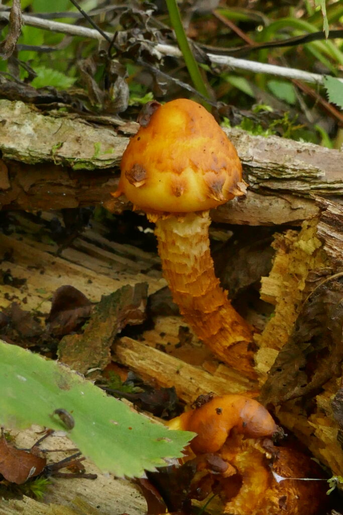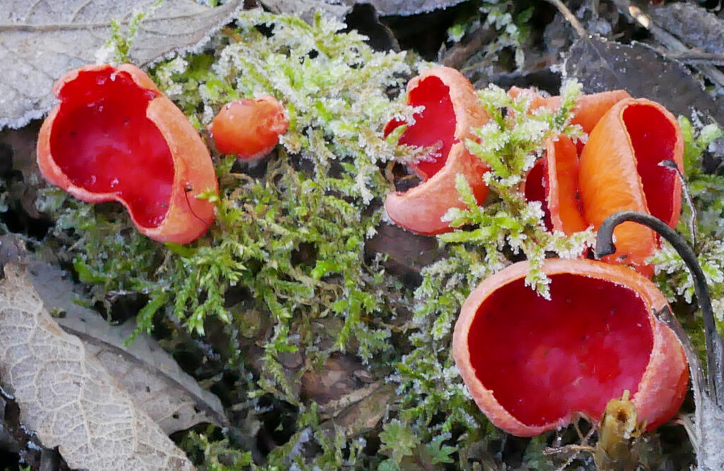 Die Lehmkaul bietet ein interessantes Spektrum an Pilzen, die von dem reichen Totholzvorkommen und der dauernden Feuchtigkeit in den baum- und buschbestandenen Bereichen profitieren. Die Menge an Speisepilzvorkommen ist so gering, dass ein Sammeln absolut nicht lohnt, aber es bleibt die Freude an der Entdeckung und Betrachtung. Und natürlich haben die Pilze eine wichtige Funktion im Kreislauf der Natur. Noch steht eine systematische Erfassung der Pilze in der Lehmkaul aus, abgebildet sind u.a. der Rote Becherling (seltene und nach Roter Liste gefährdete Pilzart, RL 3!), das Judasohr, der Büschelige Faserling(?) und der Schopftintling.