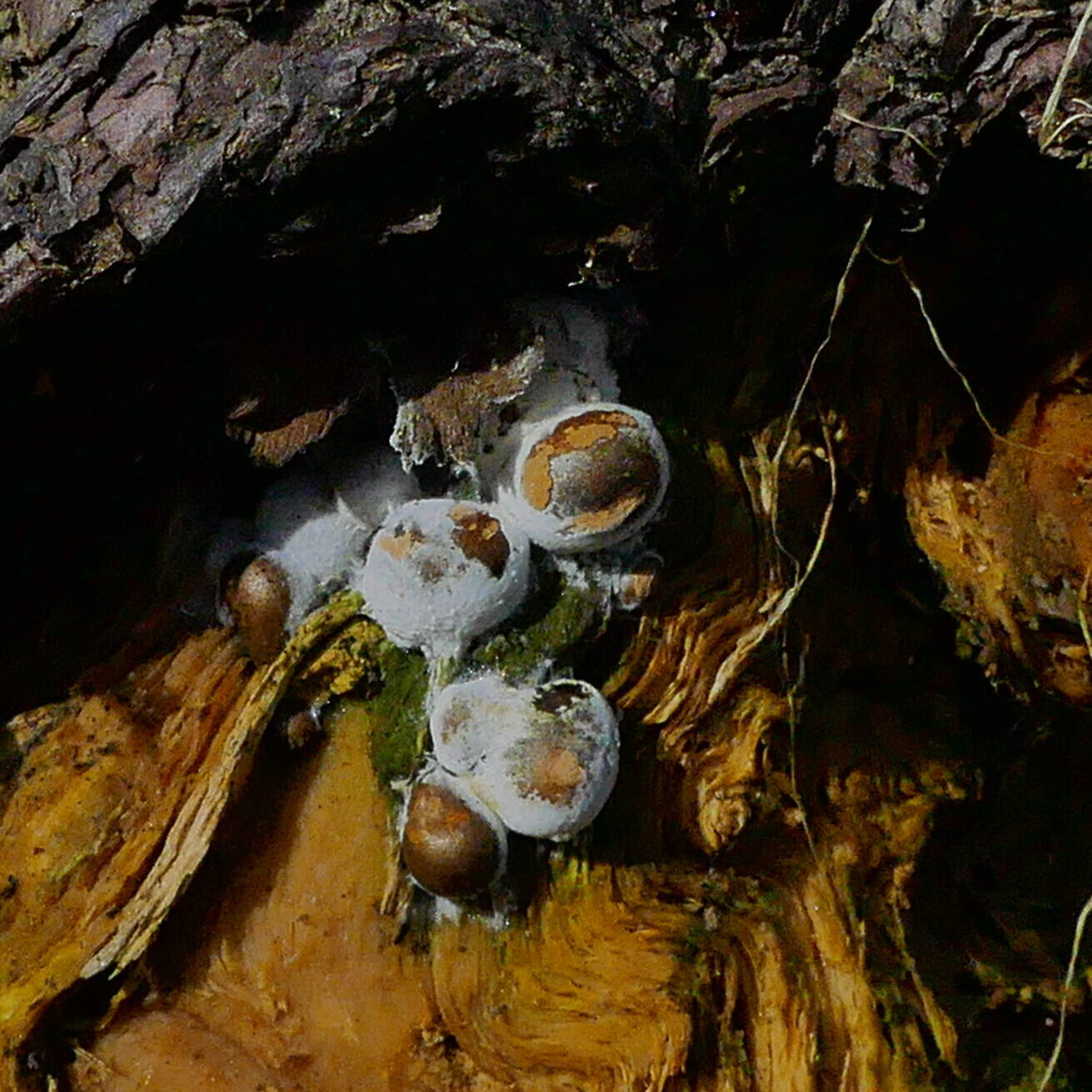 Bei den unten gezeigten Schleimpilzen handelt es sich vermutlich u.a. um den Blutmilchpilz (a-c, jeweils im Abstand von 24 Stunden aufgenommen) und um den Stäublings-Schleimpilz(d).