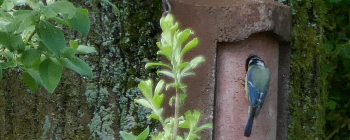 Auch ohne Nistkästen suchen und finden die Vögel in der Lehmkaul Nistmöglichkeiten. Im späten Herbst, wenn alle Blätter gefallen sind, entdeckt man die vielen Nester hoch oben in den Bäumen, wie z.B. das große Nest der Ringeltauben oder, ganz versteckt in den trockenen Stängeln der Goldrute, das kunstvoll befestigte, halbkugelige Nest der Dorngrasmücke. Und als im letzten Frühjahr eine Kohlmeise ständig im Bienenhotel ein- und ausflog, war schnell klar, dass sie es sich im Hinterzimmer des Hotels häuslich eingerichtet hatte, um ihre Jungen aufzuziehen.