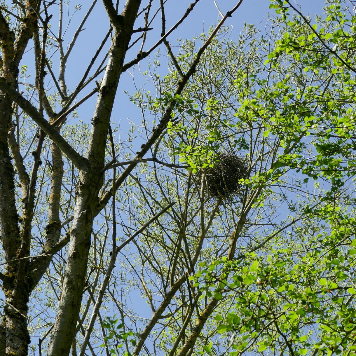 Auch ohne Nistkästen suchen und finden die Vögel in der Lehmkaul Nistmöglichkeiten. Im späten Herbst, wenn alle Blätter gefallen sind, entdeckt man die vielen Nester hoch oben in den Bäumen, wie z.B. das große Nest der Ringeltauben oder, ganz versteckt in den trockenen Stängeln der Goldrute, das kunstvoll befestigte, halbkugelige Nest der Dorngrasmücke. Und als im letzten Frühjahr eine Kohlmeise ständig im Bienenhotel ein- und ausflog, war schnell klar, dass sie es sich im Hinterzimmer des Hotels häuslich eingerichtet hatte, um ihre Jungen aufzuziehen.