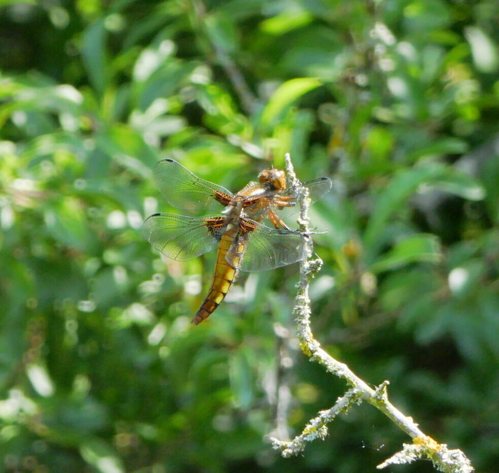 Seit der Fertigstellung des ersten Folientümpels 2022 sind die Libellen regelmäßige Mitbewohner in der Lehmkaul. Von den ca. 85 Libellenarten, die in Mitteleuropa vorkommen, wurden hier bisher 7 Arten nachgewiesen. Da die meisten Libellenarten in der Nähe von stehenden Gewässern leben, bieten die mittlerweile 4 fertiggestellten Folientümpel neuen Lebensraum für viele Arten. Aber auch die Blaue Prachtlibelle, die eher an Flüssen oder langsam fließenden Gewässern anzutreffen ist, hat der Lehmkaul schon Besuche abgestattet. Die faszinierenden Flugkünste der Libellen und ihr Paarungsverhalten sind ein großer Anreiz, sich mit den Libellen weiter zu beschäftigen. (Für die Bestimmung wurde auf das Buch „Die Libellen Deutschlands“ von Michael Frank und Angela Bruens zurückgegriffen.)