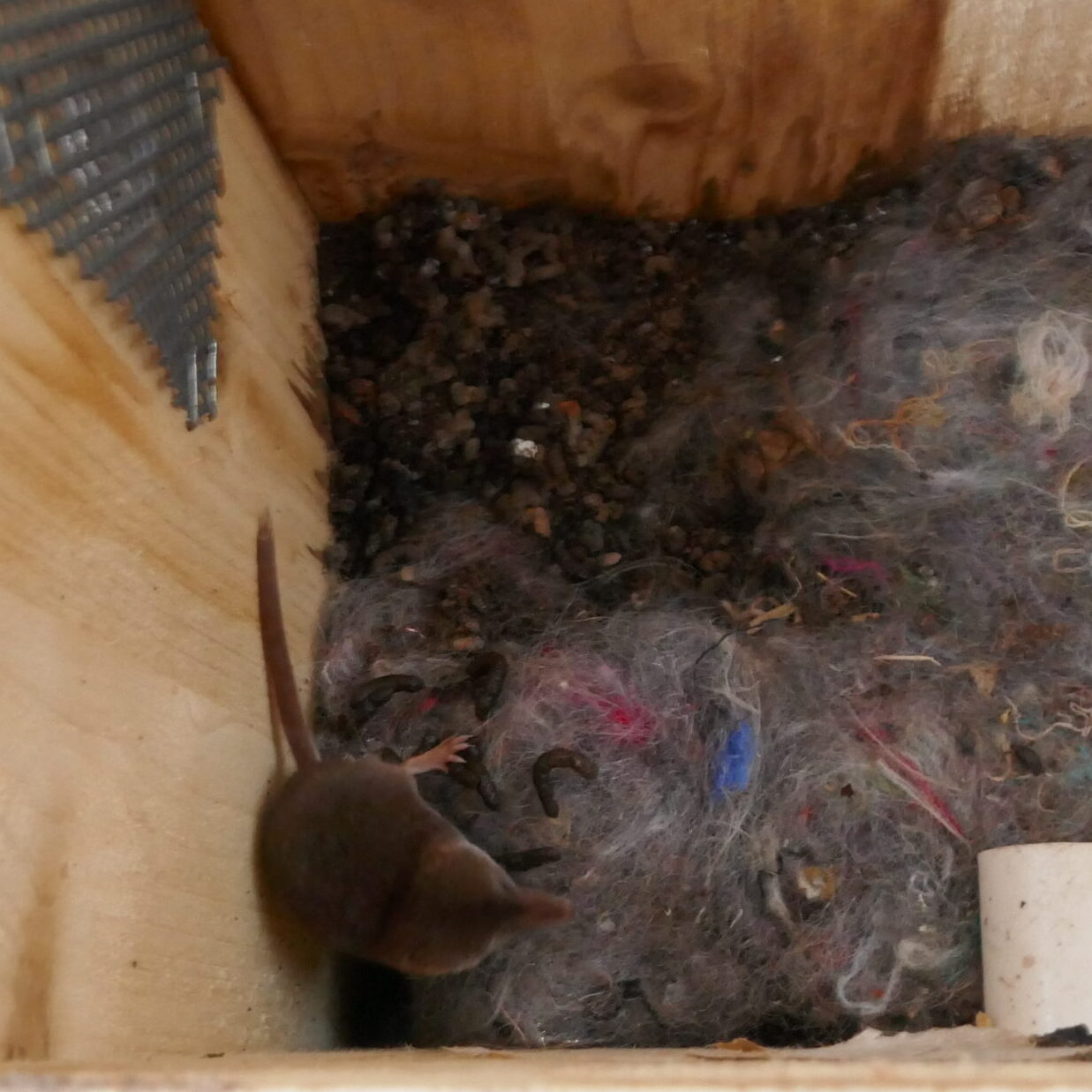 Die Spitzmaus lebt ebenfalls auf dem Gelände, fotografiert werden konnte bisher nur eine Spitzmaus, die es sich wohnlich in einem Hummelnistkasten eingerichtet hatte.
