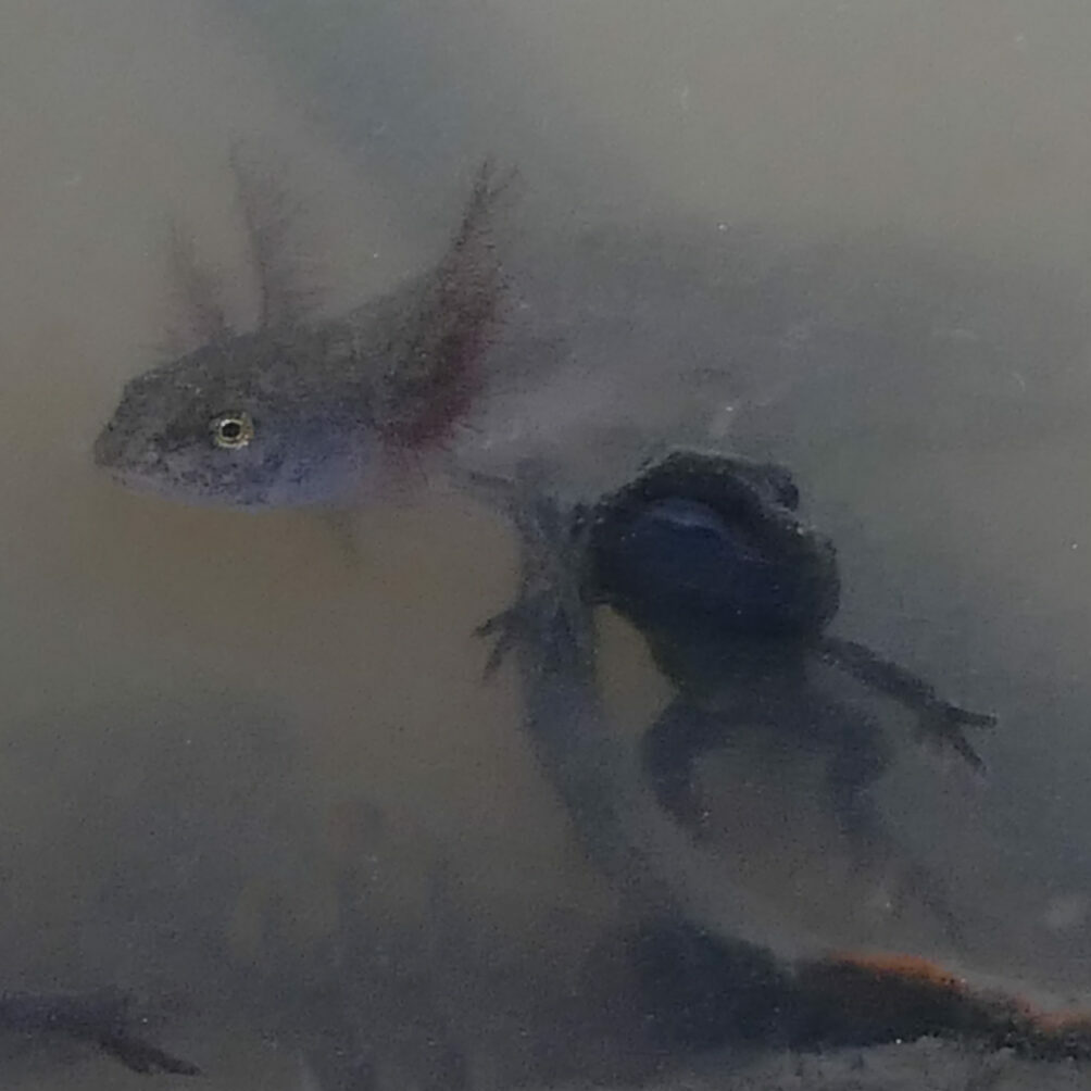 In der Lehmkaul fanden sich 2020 keine Bergmolche im flachen Wasser, als der Tümpel noch nicht freigelegt und schon Ende April trocken gefallen war, ebenso wenig wie im Gelände, wo die Molche außerhalb der Paarungszeit (allerdings sehr versteckt) leben. Im bearbeiteten Tümpel stellten sich 2021 aber prompt die Bergmolche ein und sorgten für reichlich Nachwuchs.