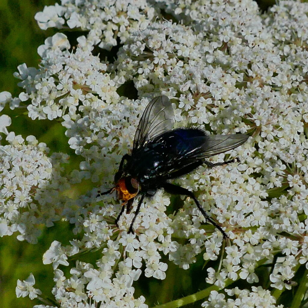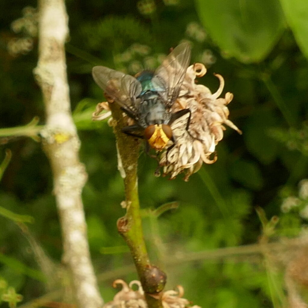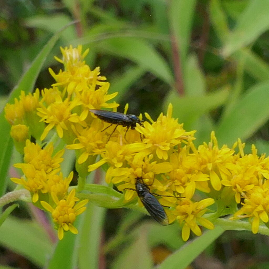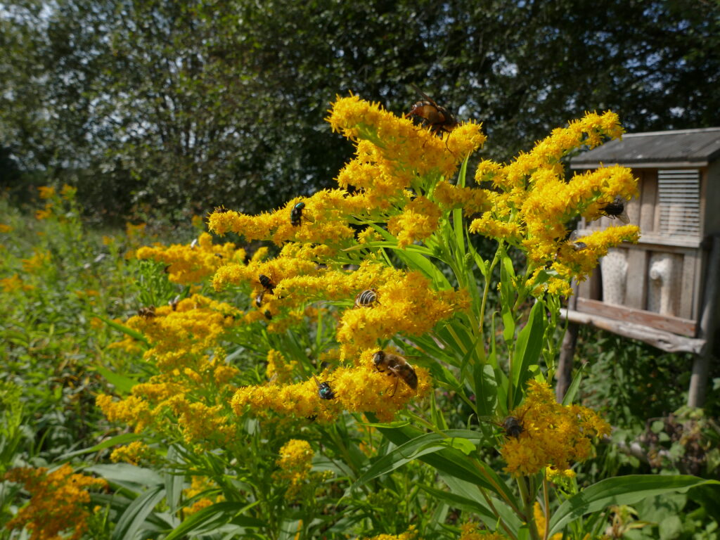 Wenn im Spätsommer die Kanadische Goldrute blüht, sind es vor allem Fliegen, die sich massenhaft auf den Blüten einfinden, um sich an Pollen und Nektar zu bedienen. In Deutschland gibt es sicher mehr als 5000 Fliegenarten, allein von der Familie der Schwebfliegen sind mehr als 400 Arten bekannt. Die genaue Artbestimmung ist oft schwierig, die unten gezeigten Fliegen-Fotos aus der Lehmkaul zeigen die Vielfalt, ohne immer eine genaue Bestimmung garantieren zu können.
